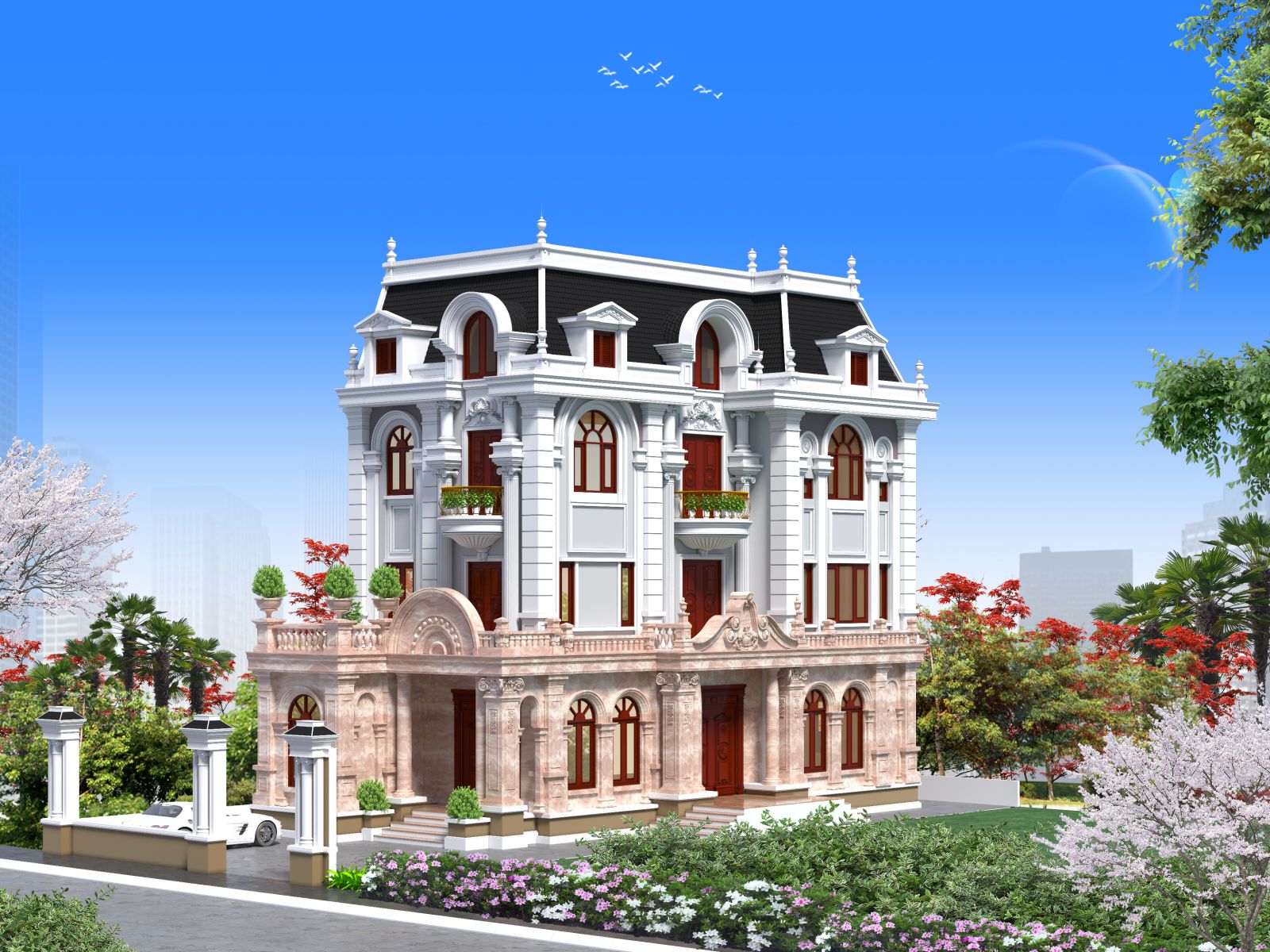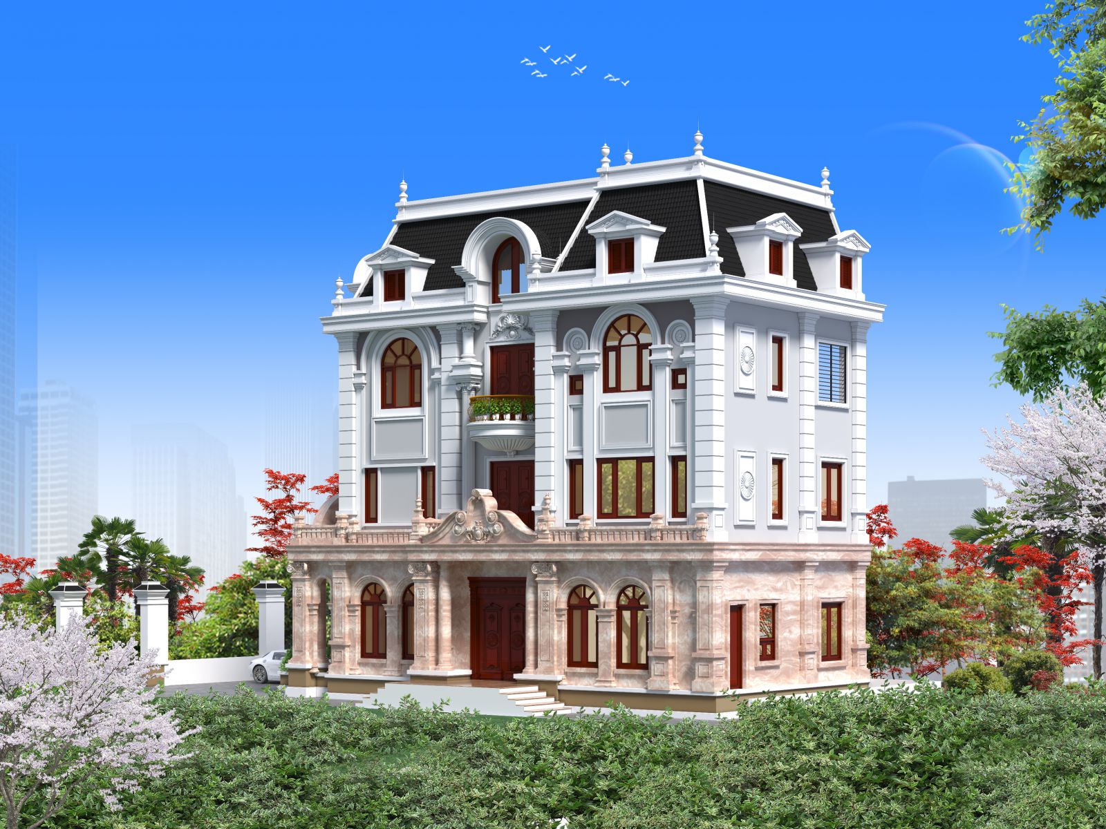 Kết cấu 4 tầng với hệ mái Mansard kết hợp với ngoại thất tầng 1 được ốp đá màu hồng trên tổng thể màu trắng chủ đạo đem lại cho căn biệt thự một vẻ đẹp uy nghi và ấn tượng. Tất cả giúp cho căn biệt thự có được nét dạn dày, khỏe khoắn, linh hoạt nhưng không kém phần ngăn nắp và khoa học.