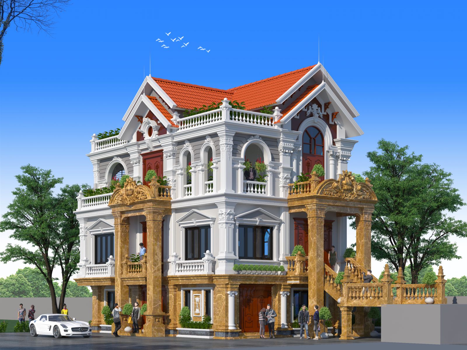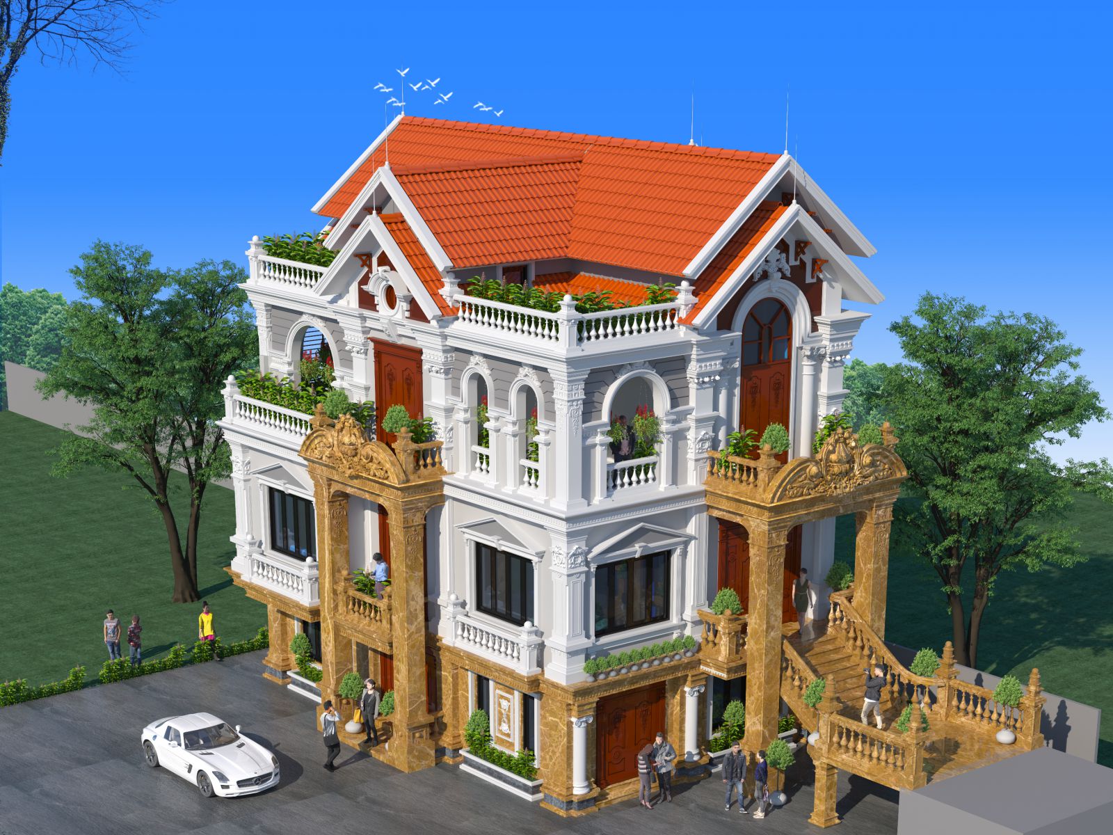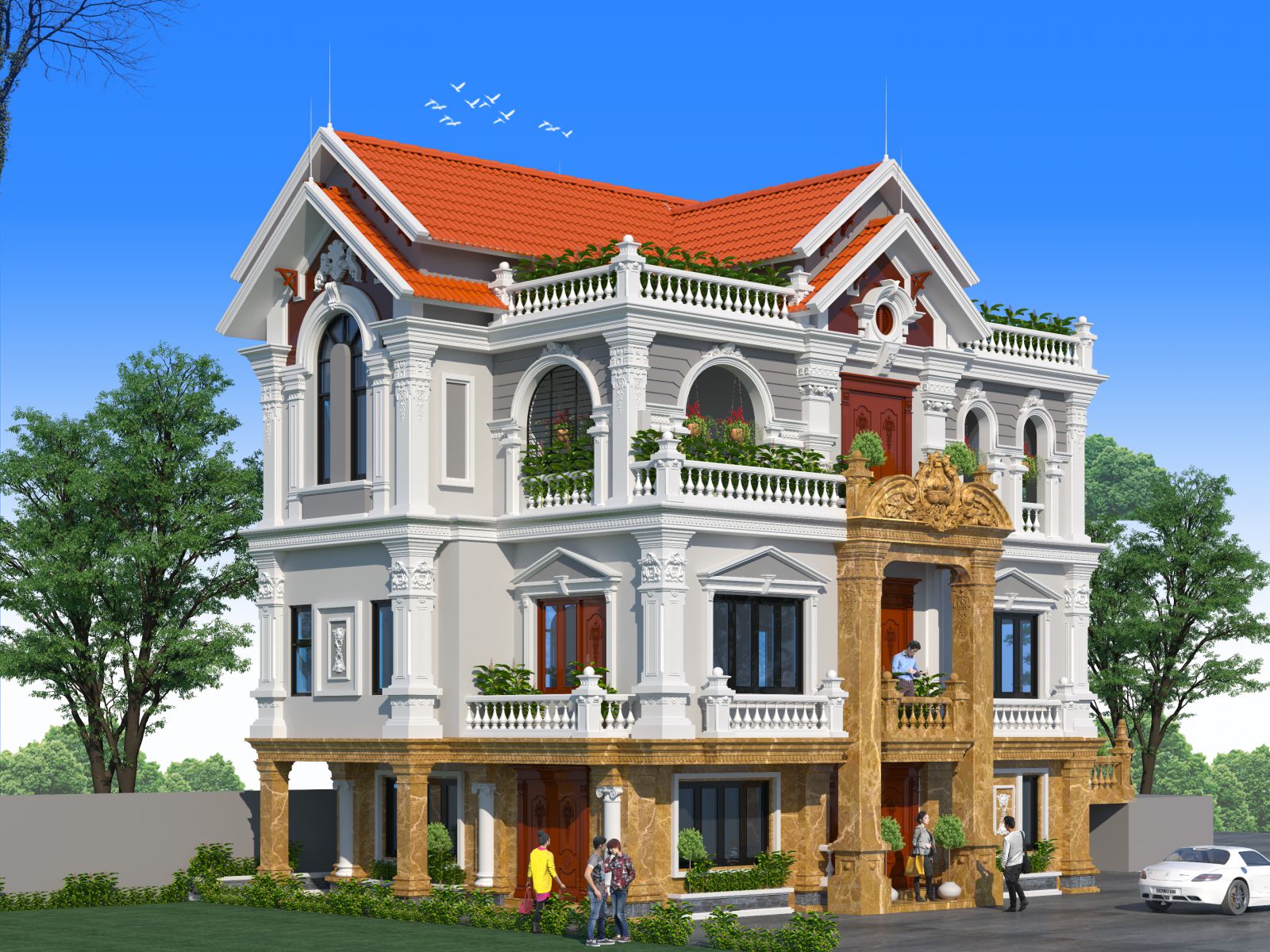 Với gam màu trắng chủ đạo hòa quyện với tầng một được ốp đá sang trọng kết hợp với mái ngói đỏ tạo nên tổng thể một ngôi biệt thự uy nghi sang trọng.