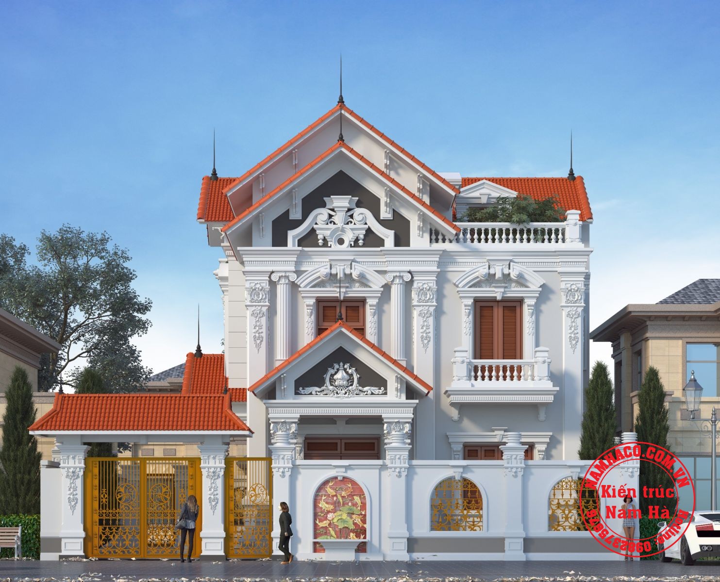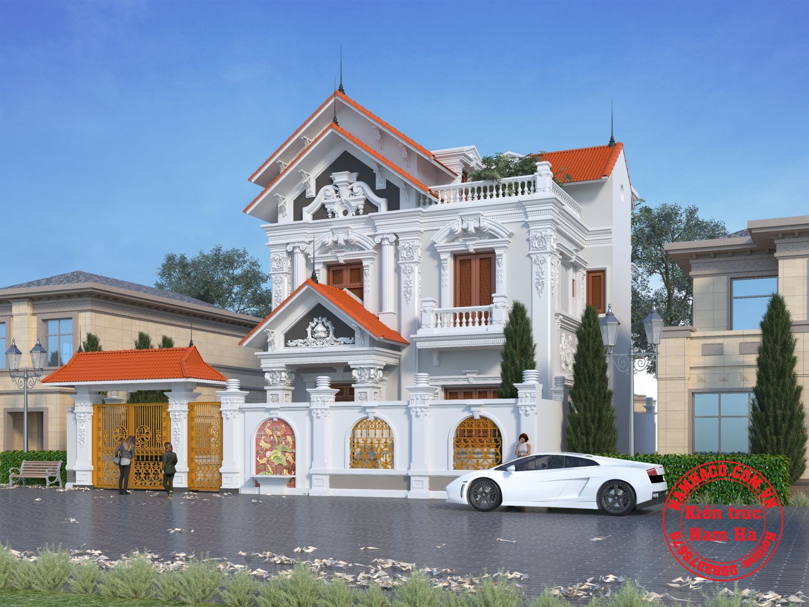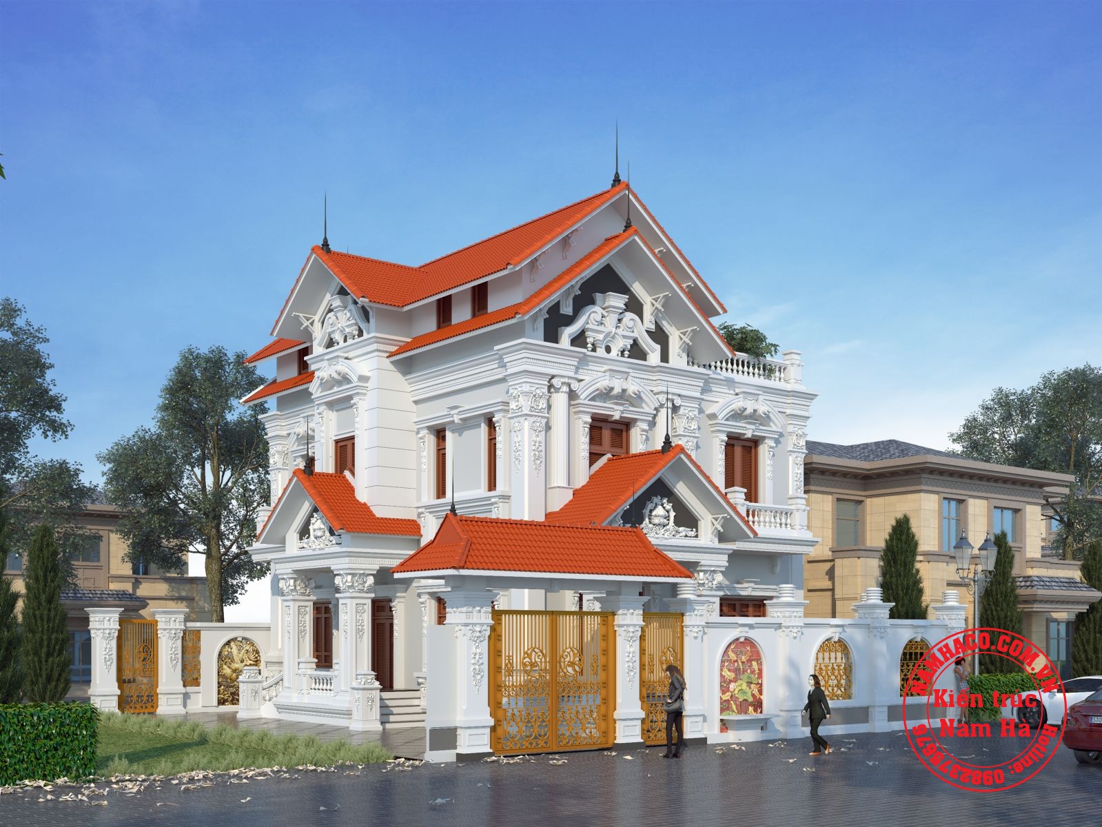Công trình biệt thự 2 tầng mái Thái được thiết kế theo phong cách kiến trúc tân cổ điển với kiểu dáng thanh lịch và rất sang trọng. Bên cạnh đó, việc sử dụng hệ mái Thái đỏ kết hợp với tone trắng chủ đạo của kiến trúc mặt tiền đã mang đến cho ngôi nhà sự hài hòa về màu sắc. Ngôi nhà biệt thự 2 tầng tân cổ điển châu Âu có diện tích xây dựng 8x13.5m được thiết kế và thi công trên khu đất của chủ đầu tư tại Bình Lục Hà Nam.