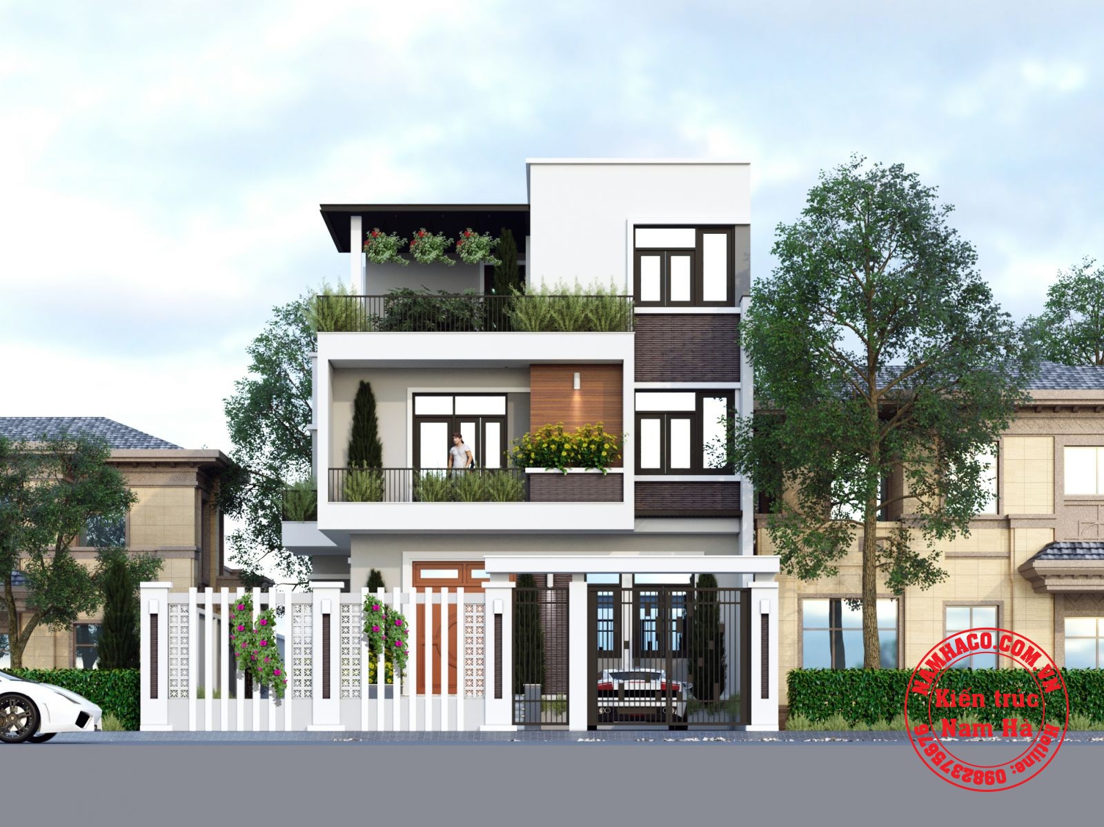 Mẫu nhà biệt thự phố đẹp 3 tầng được kiến trúc Nam Hà thiết kế cho gia đình anh Hưng với hình khối rõ ràng, dứt khoát; sử dụng 100% vật liệu hiện đại khỏe khoắn giúp nổi bật. Biệt thự sử dụng phần nhiều khung nhôm kính xingfa kết hợp cửa chính bằng gỗ tự nhiên chắc chắn phối cùng tone với gạch thẻ trầm tạo nên nét khỏe khoắn, bứt phá mà kiên cố.
