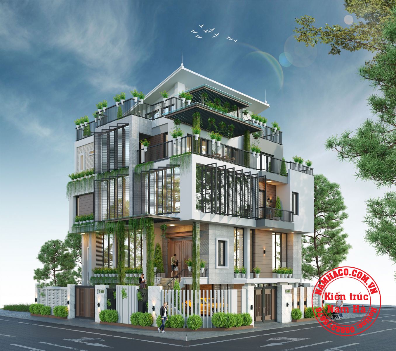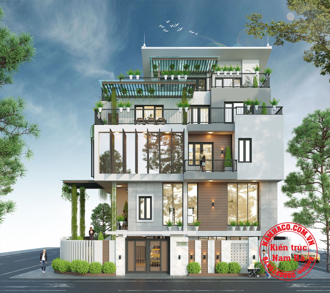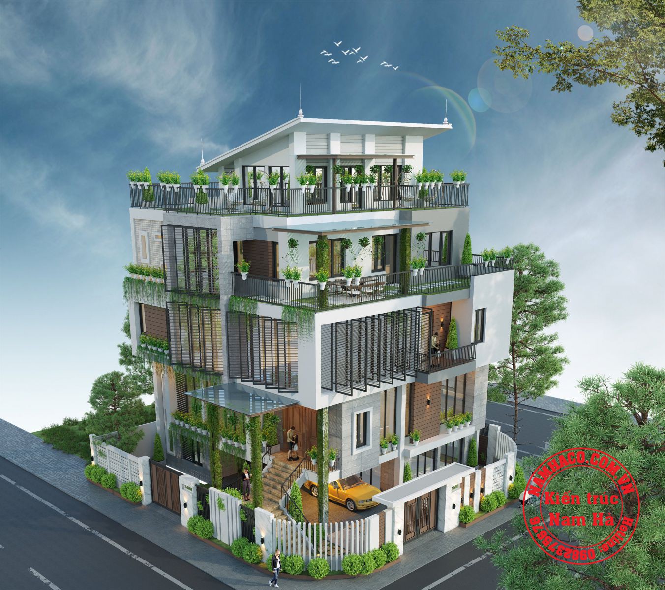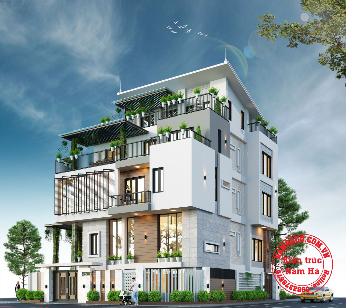 Mẫu thiết kế biệt thự phố 4 tầng 2 mặt tiền tạo lạc tại Lam Hạ sở hữu 2 mặt tiền thông thoáng với đường lớn là điều kiện thuận lợi để có thể khoe hết được vẻ đẹp sang trọng và hiện đại của ngôi biệt thự phố 4 tầng hiện đại này. Trước hết, chúng ta cùng đón xem vẻ đẹp của ngôi biệt thự phố 4 tầng 2 mặt tiền kiến trúc hiện đại này qua những hình ảnh phối cảnh mà chúng tôi muốn giới thiệu sau đây. Sự phối màu sắc khéo léo với tone màu trắng là màu chủ đạo tạo nên vẻ trẻ trung và hiện đại của phối cảnh biệt thự hiện đại 4 tầng 2 mặt tiền. KTS Nam Hà rất tinh tế khi kết hợp màu của hệ thống nhôm kính cường lực vào trang trí làm điểm nhấn cho diện tường giúp giảm sự cứng nhắc và nhàm chán của mặt bên ngôi biệt thự phố.