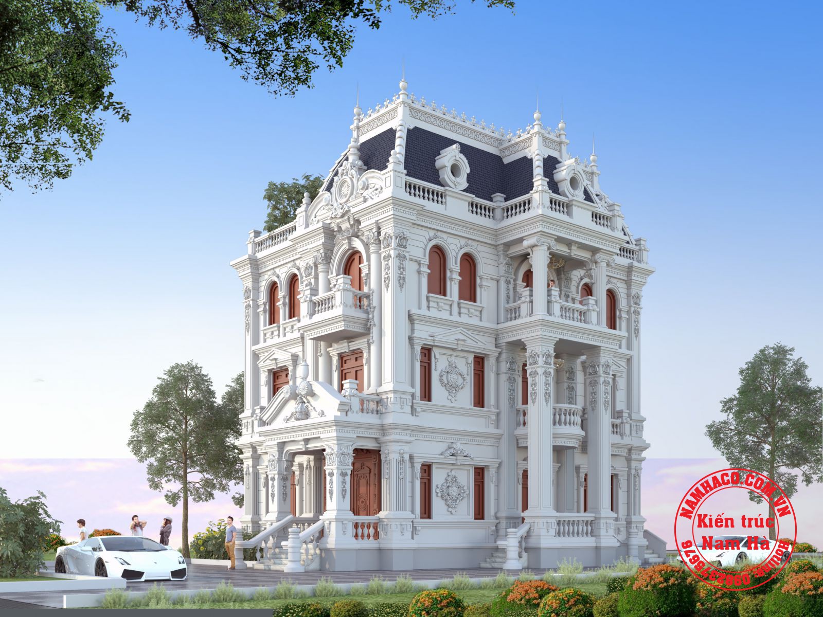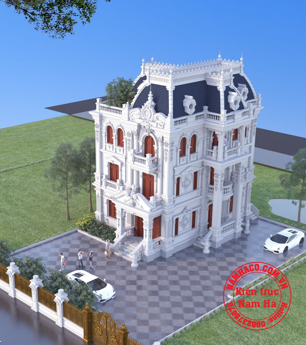 Thiết kế biệt thự 4 tầng mặt tiền 12m được thiết kế trên một mảnh đất vuông vắn tại Thanh Liêm Hà Nam. Đây là mẫu nhà 4 tầng theo phong cách cổ điển sang trọng. Với hình dáng kiến trúc cách tân đầy ấn tượng. Ngôi nhà 4 tầng được thiết kế đáp ứng những nhu cầu rất thiết thực của chủ đầu tư. Về kiến trúc ngoại thất theo phong cách Pháp sử dụng những chi tiết, hoa văn trang trí đẹp mắt, bền vững nhưng không rườm rà, tạo được sự cân bằng về thị giác khi nhìn vào công trình. Về không gian nội thất phải sang trọng, thông thoáng đồng nhất một phong cách và đảm bảo sự tiện nghi, khoa học nhất.
