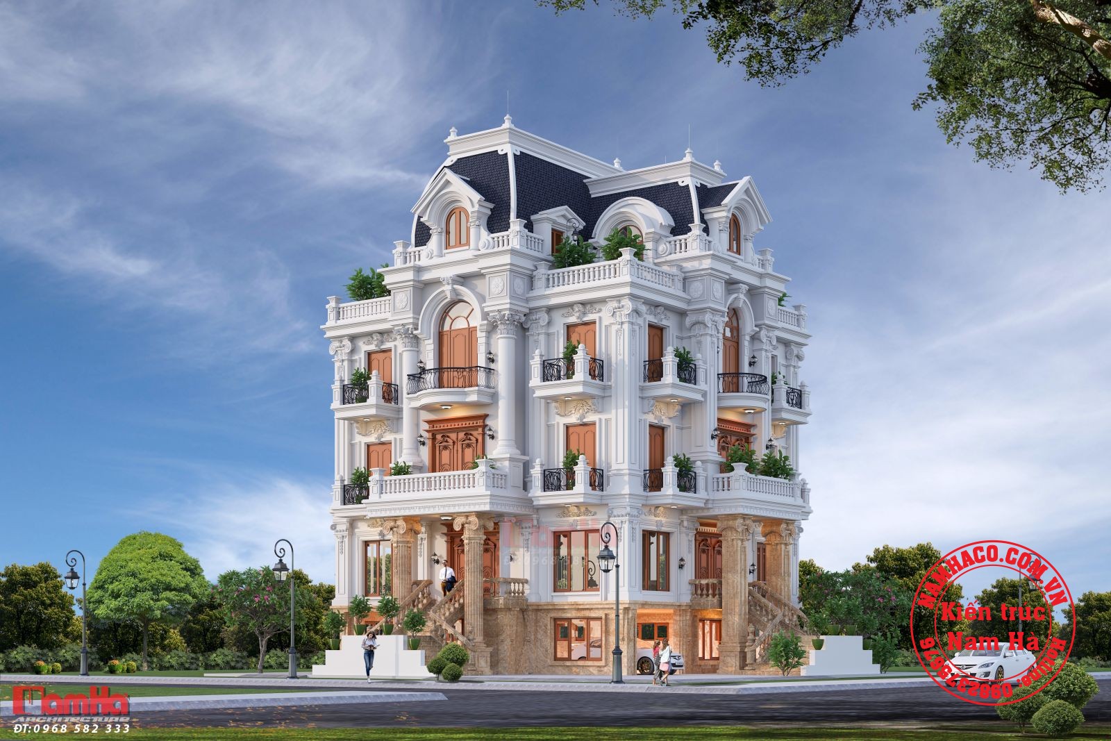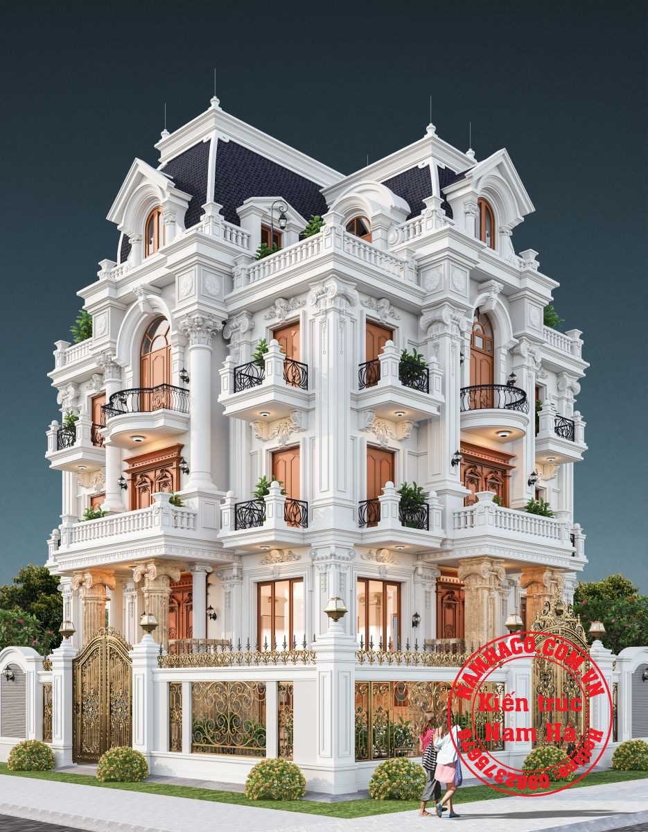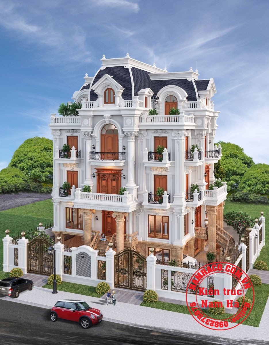 Xét về hình khối kiến trúc biệt thự tân cổ điển mang đến một không gian sống đẳng cấp và tiện nghi, cùng với những trải nghiệm nguy nga của một hình khối kiến trúc mặt tiền choáng ngợp và đồ sộ. Xu hướng thiết kế nhà đẹp này thích hợp với những hộ gia đình có điều kiện về tài chính, đồng thời muốn khẳng định vị thế cũng như thẩm mỹ của bản thân. Mẫu thiết kế biệt thự tân cổ điển 5 tầng sang trọng và tráng lệ dưới đây mà kiến trúc Nam Hà sắp sửa giới thiệu đến các bạn cũng không thua kém gì một tòa lâu đài đồ sộ và nguy nga.