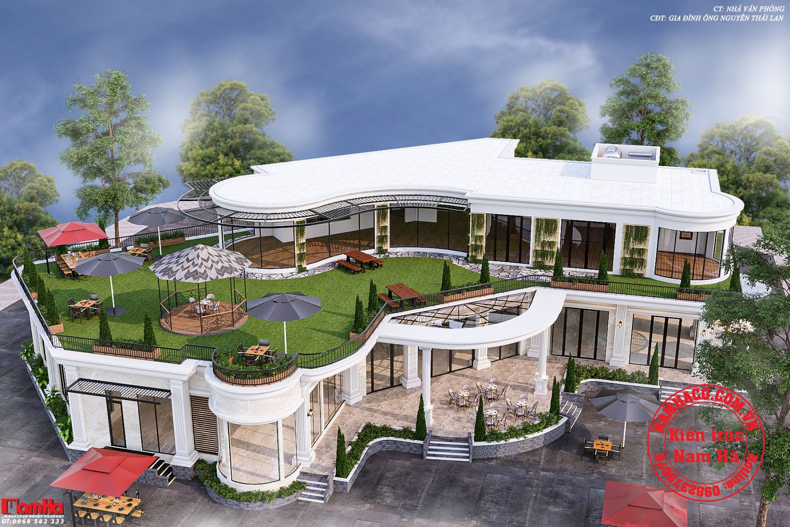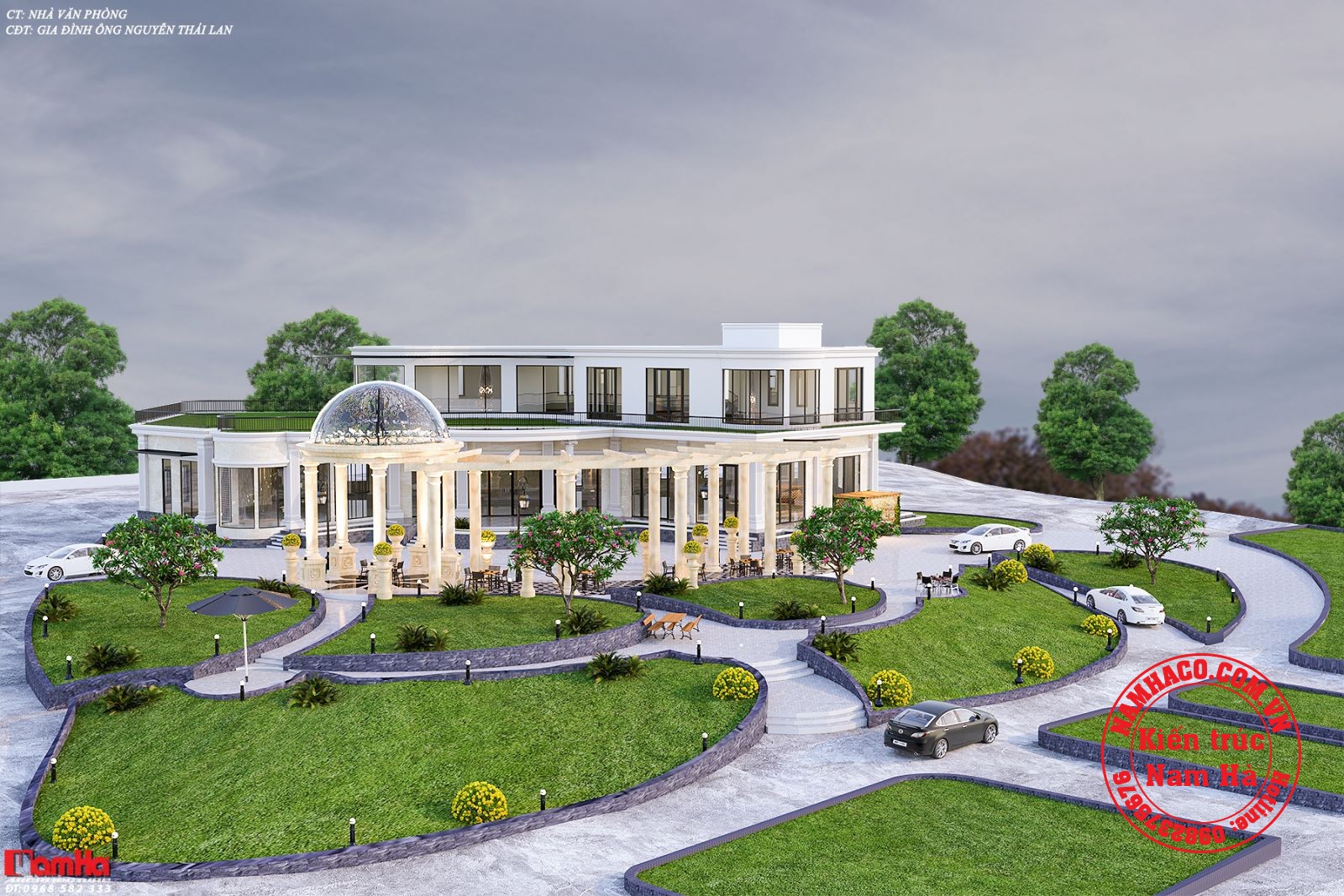 Dựa vào những yêu cầu của doanh nghiệp, kiến trúc sư sẽ đưa ra những ý tưởng và thiết kế hợp lý. Ngoài ra, phụ thuộc vào từng phòng ban, thiết kế sẽ có những tiêu chuẩn phù hợp. Tuy nhiên. Thiết kế của mẫu nhà văn phòng cần đảm bảo tính thống nhất, cân đối và hài hòa.Với lợi thế khu đất rộng Kiến trúc Nam Hà đã thiết kế mẫu nhà văn phòng với khu vườn rộng tạo cảm giác thoải mái cho những lúc làm việc căng thẳng.