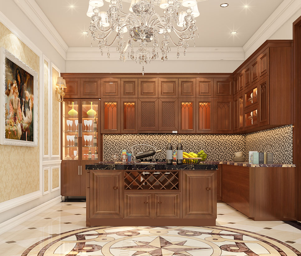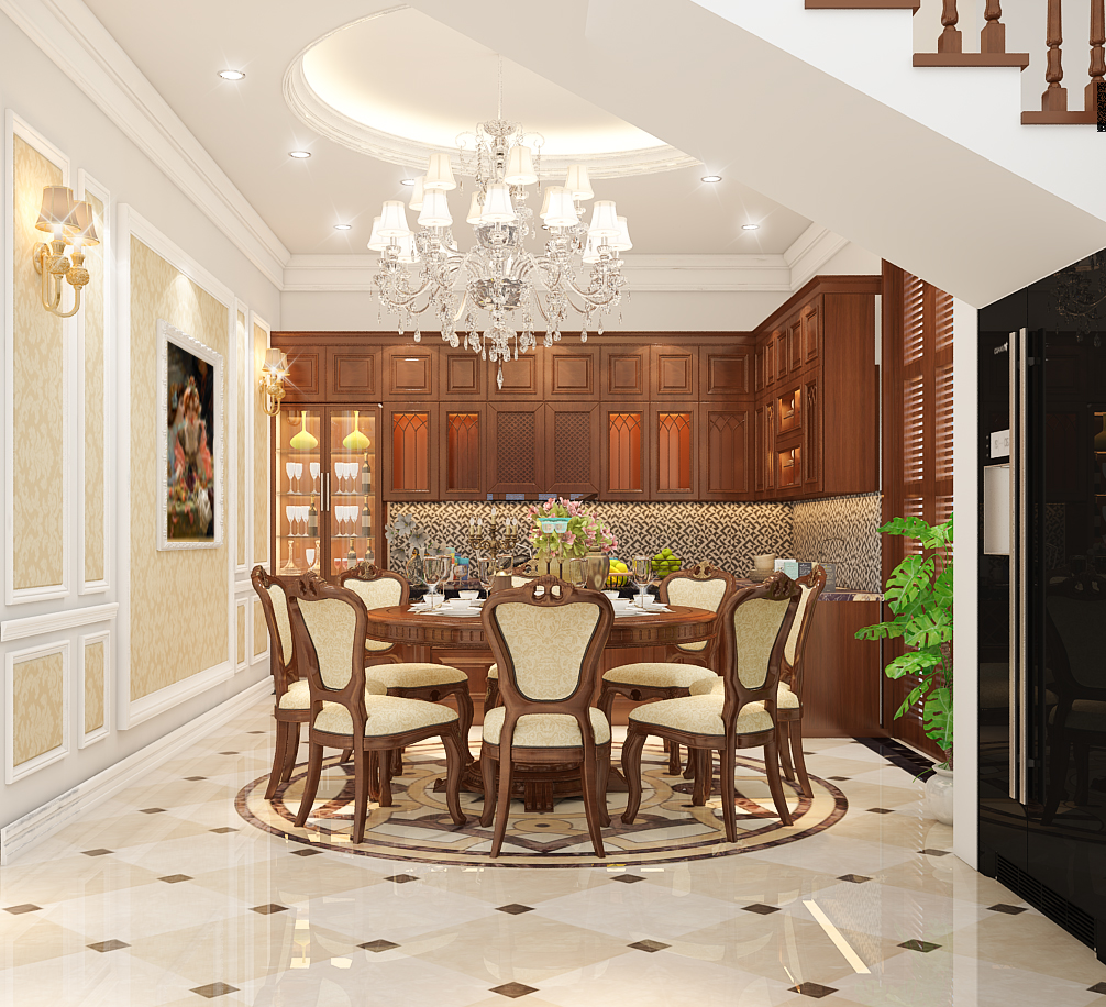 Thiết kế nội thất phòng bếp chiếc đèn chùm được bố trí phía trên bàn ăn khiến cho không gian thêm sự lãng mạn hơn. Bộ bàn ăn với sắc màu nâu đặc trưng đến từ chất liệu gỗ tự nhiên. Khác hẳn với những gì chúng ta vẫn thường thấy ở những phòng bếp với thiết kế biệt thự hiện đại. Với không gian này mang đến cho chúng ta một sự trải nghiệm mới thú vị và ấn tượng hơn.