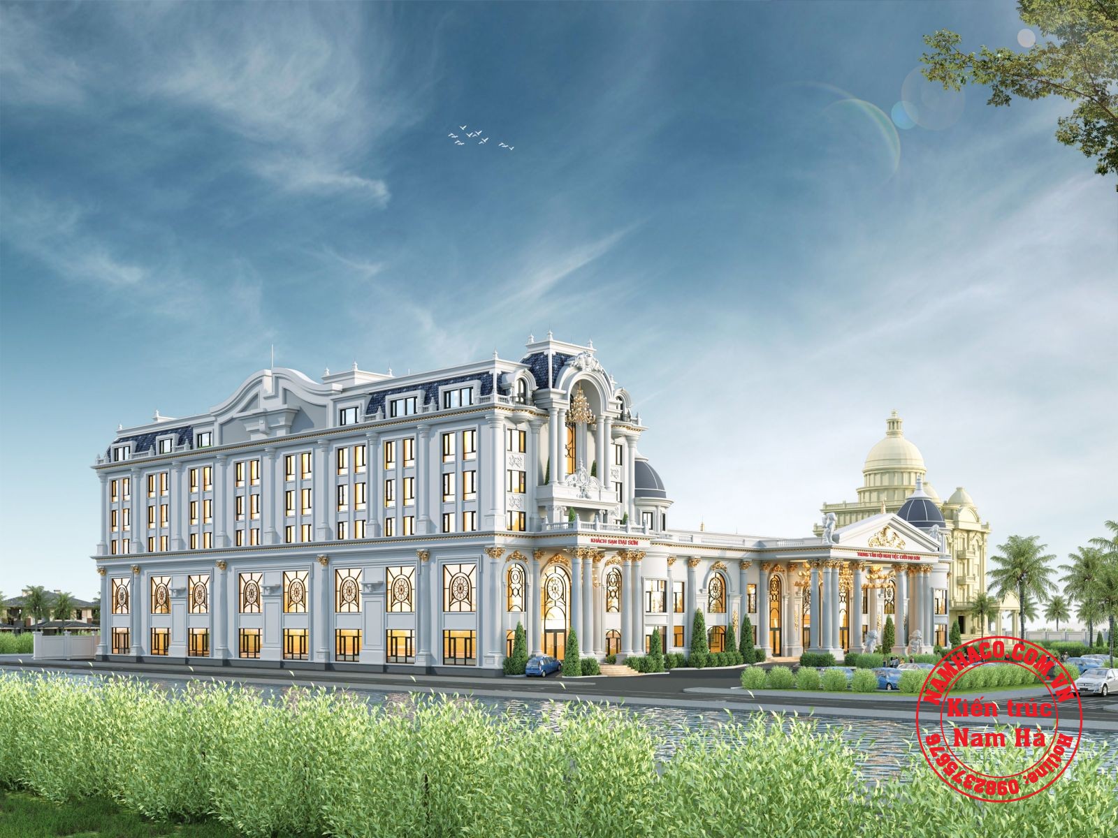 Thiết kế khách sạn tân cổ điển ngày càng được ưa chuộng và đang trở thành xu hướng hiện nay. Đặc biệt, các công trình khách sạn thường được thiết kế nhằm đa dạng hóa loại hình kinh doanh như khách sạn nhà hàng, tổ chức sự kiện, tiệc cưới,… Và mỗi vị chủ đầu tư khi quyết định xây dựng khách sạn thường định hình sẵn cho mình mô hình kinh doanh hợp lý, độc đáo. Từ đó dễ dàng thu hút nhiều lượng khách hàng sử dụng dịch vụ. Mẫu thiết kế khách sạn nhà hàng trung tâm tiệc cưới đẹp tại Ninh Bình của kiến trúc Nam Hà là một mô hình kinh doanh điển hình.